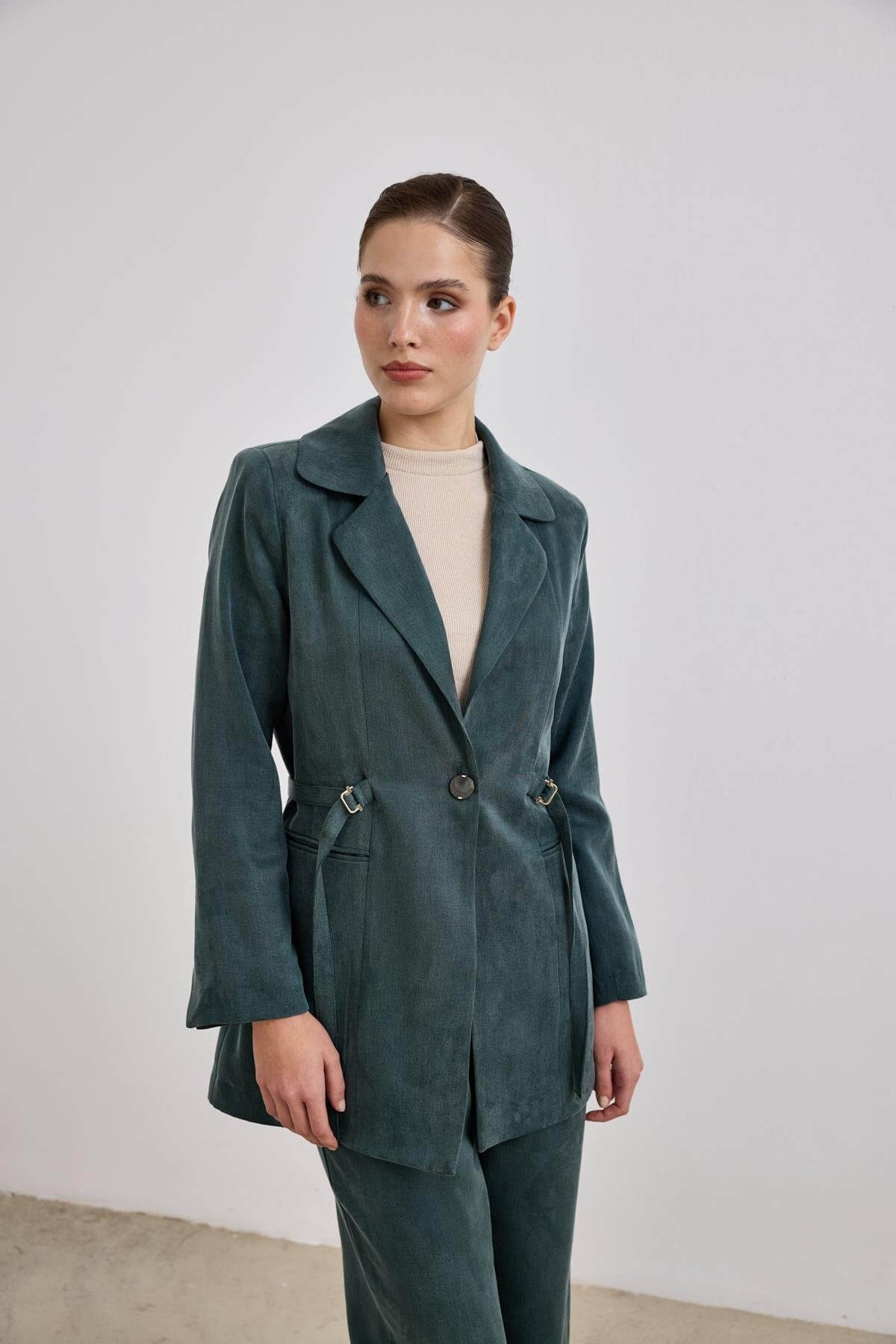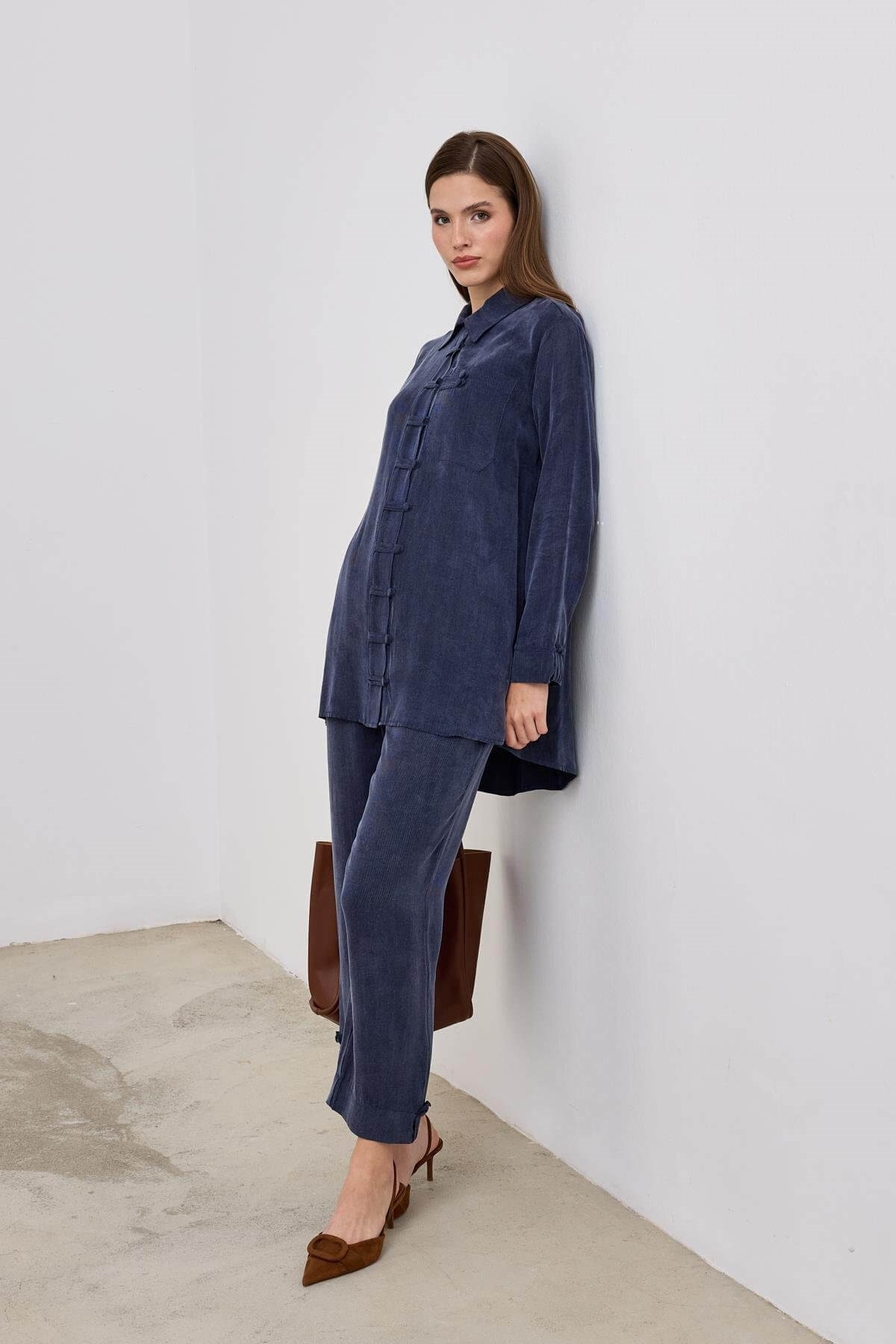 Emosh Britli Düğmeli Pantolonlu Takım: Lyocell ve viskoz karışımı dokusuyla dökümlü ve ferah bir yapıya sahiptir. Britli detaylarıyla şehir stiline güçlü bir vurgu yapar.